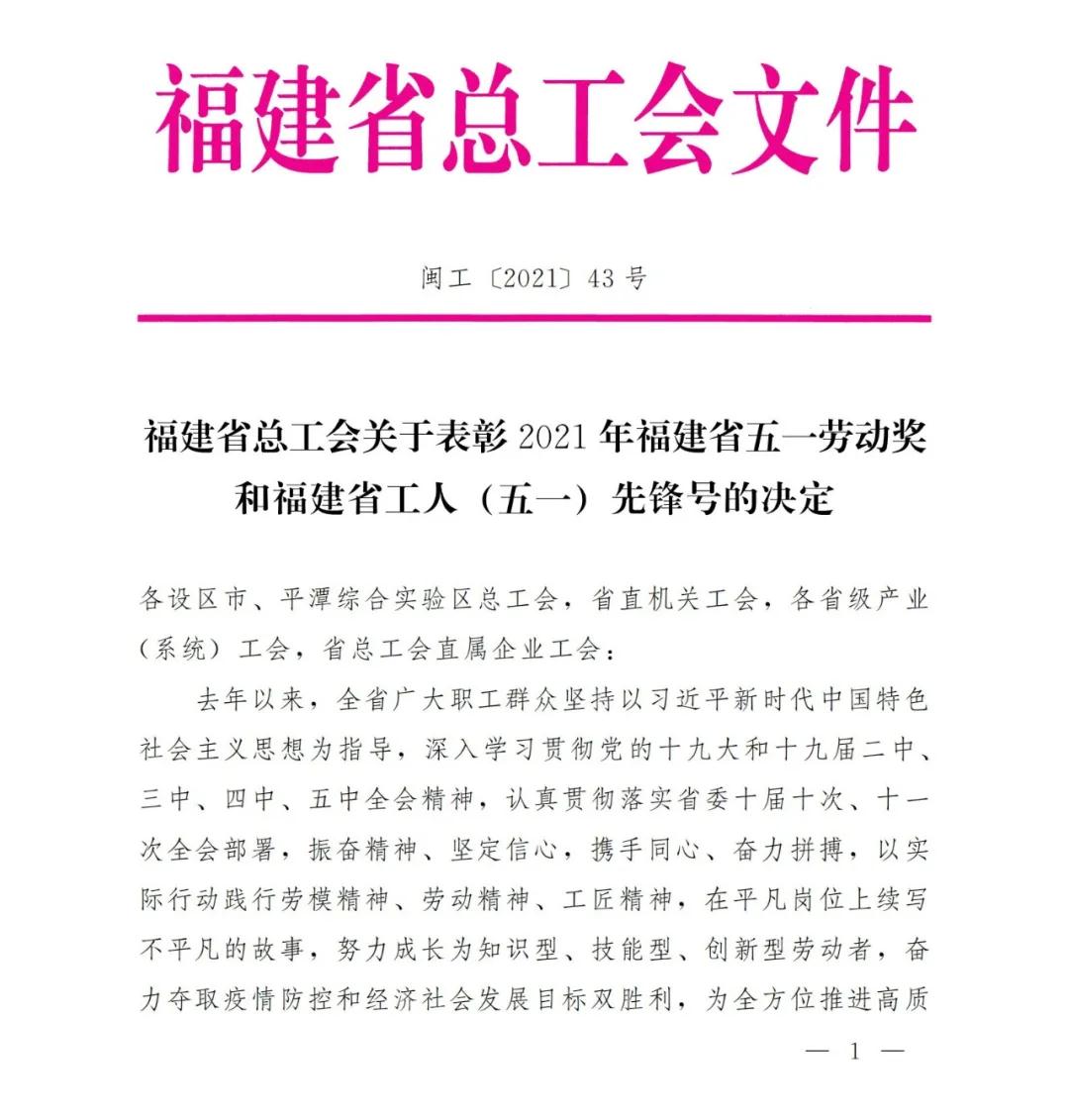 近日,省总工会通报表彰了2021年福建省五一劳动奖和福建省工人 (五一) 先锋号,九州酷游官方网页荣获福建省五一劳动奖状。