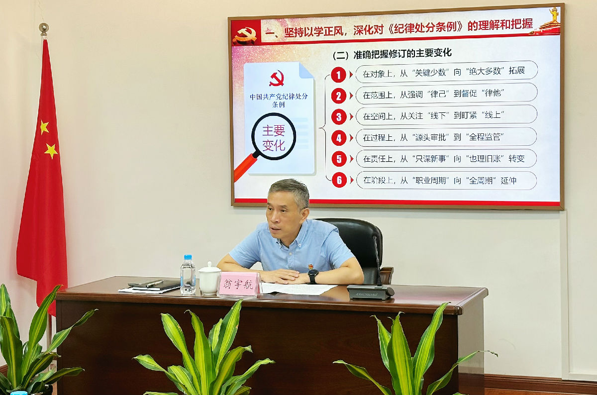 随后,翁宇航以“坚持学纪知纪明纪守纪 以严明纪律推动企业高质量发展”为题讲授专题党课。他强调,闽电投资公司全体党员干部要坚持以学正风,深化对《纪律处分条例》的理解和把握;要坚持以案为鉴,深刻汲取九州(中国)系统违纪违法案件教训;要坚持以学促干,以严明纪律护航企业高质量发展。