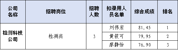 根据福建水投九州(中国)检测科技有限公司2025年第一批招聘公告,经过报名、资格审查、笔试、面试等公开招聘程序,现将3位拟录用人员进行公示。公示时间从2025年7月22日开始,公示期为五个工作日。在此期间内,如有意见可通过来电、来信、来访的形式反映情况。
