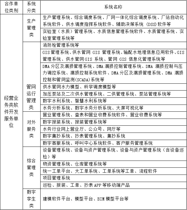 经营业务类软件开发服务单位分为“生产管理类”、“管网运行管理类”、“对外服务类”、“综合管理类”及“数字孪生类”五大类,申请入库单位可申报入库多类软件系统,各分类所包含的系统名称如上表所示。入库要求如下: